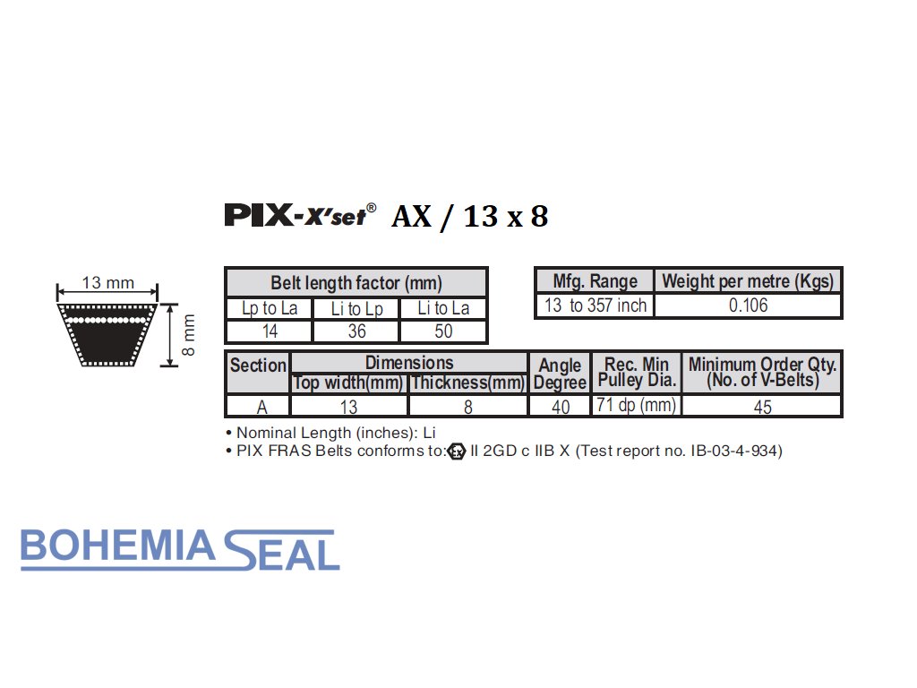 Industriekeilriemen AX nach ISO 4184, Hersteller PIX, Marke PIX-X'TRA. Breite des Keils auf der Fläche 13 mm, Höhe des Keils 8 mm. Gemessen hauptsächlich an der Innenlänge.