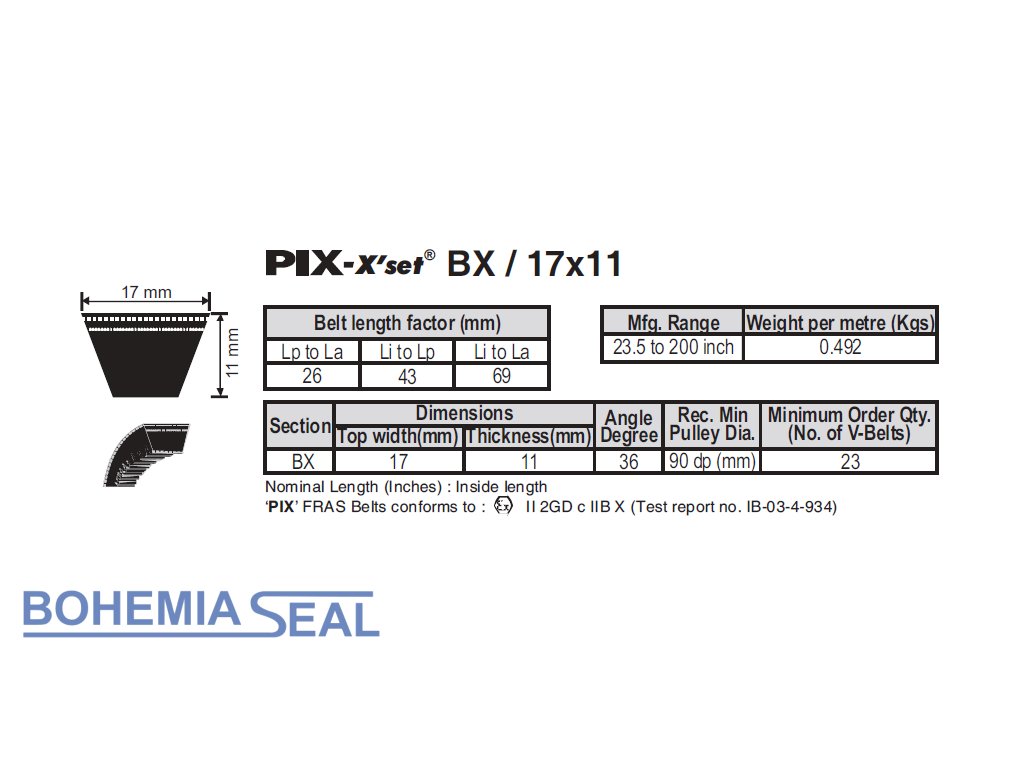 Industriekeilriemen BX nach ISO 4184, Hersteller PIX, Marke PIX-X'TRA. Breite des Keils auf der Fläche 17 mm, Höhe des Keils 11 mm. Gemessen hauptsächlich an der Innenlänge.