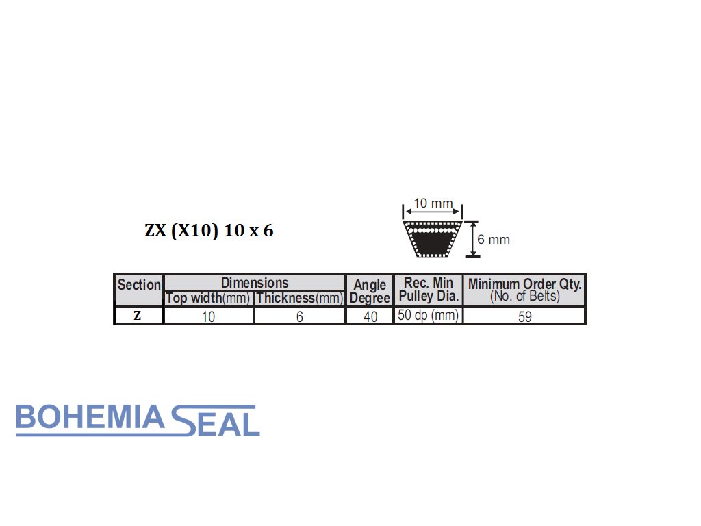 Industriekeilriemen XPZ nach ISO 4184, Hersteller PIX, Marke PIX-X'TRA. Die Breite des Keils auf der Oberfläche beträgt 10 mm, die Höhe des Keils beträgt 6 mm. Gemessen hauptsächlich an der Innenlänge.