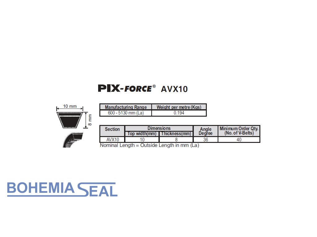 Kfz-Keilriemen AVX 10 nach DIN7753, Hersteller PIX, Marke PIX-FORCE. Die Breite des Keils auf der Oberfläche beträgt 10 mm, die Höhe des Keils beträgt 8 mm. Hauptsächlich an der Oberfläche gemessen.