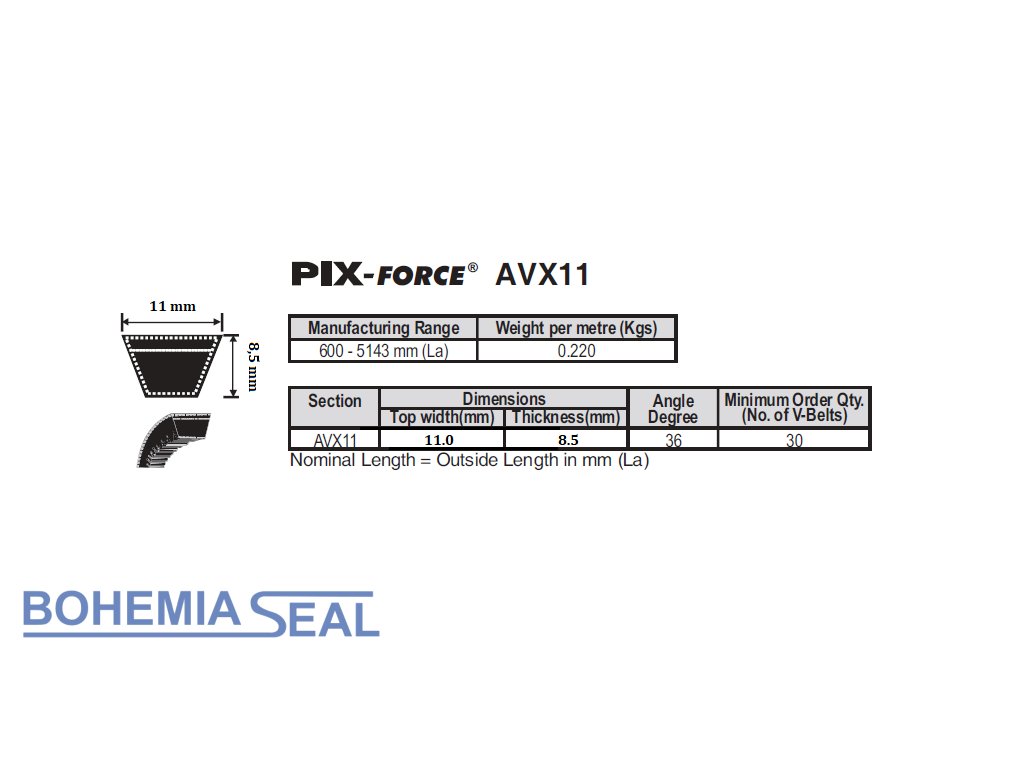 Kfz-Keilriemen AVX 11 nach DIN7753, Hersteller PIX, Marke PIX-FORCE. Die Breite des Keils auf der Oberfläche beträgt 11 mm, die Höhe des Keils beträgt 8,5 mm. Hauptsächlich entlang der Oberfläche gemessen.