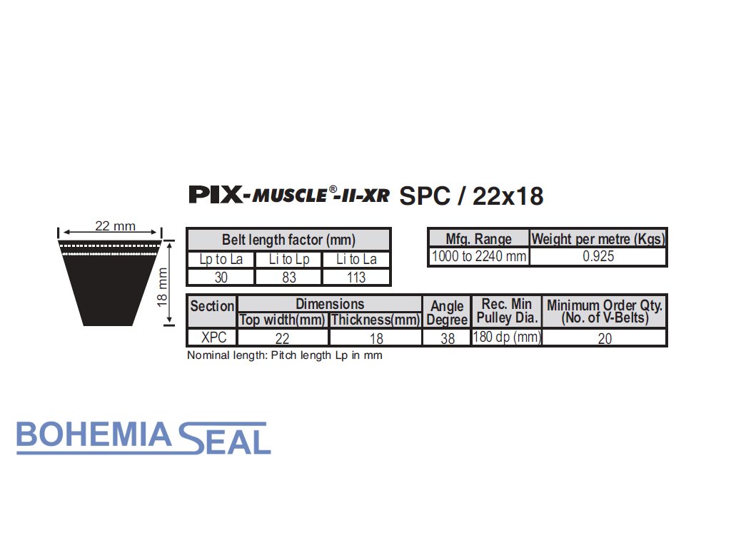 Verstärkter SPC-Industriekeilriemen für hohe Kraftübertragung, Hersteller PIX, Marke PIX-MUSCLE-XRII. Breite des Keils auf der Fläche 22 (21) mm, Höhe des Keils 18 mm. Wird hauptsächlich anhand der Faserlänge gemessen.