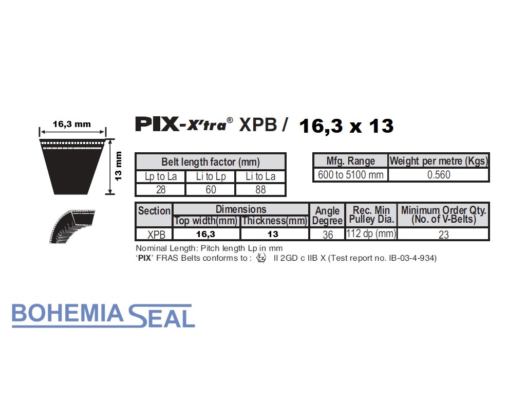 Industriekeilriemen XPZ nach BS 3790, Hersteller PIX, Marke PIX-X'TRA. Breite des Keils auf der Fläche 16,3 (17) mm, Höhe des Keils 13 (14) mm. Wird hauptsächlich anhand der Faserlänge gemessen.