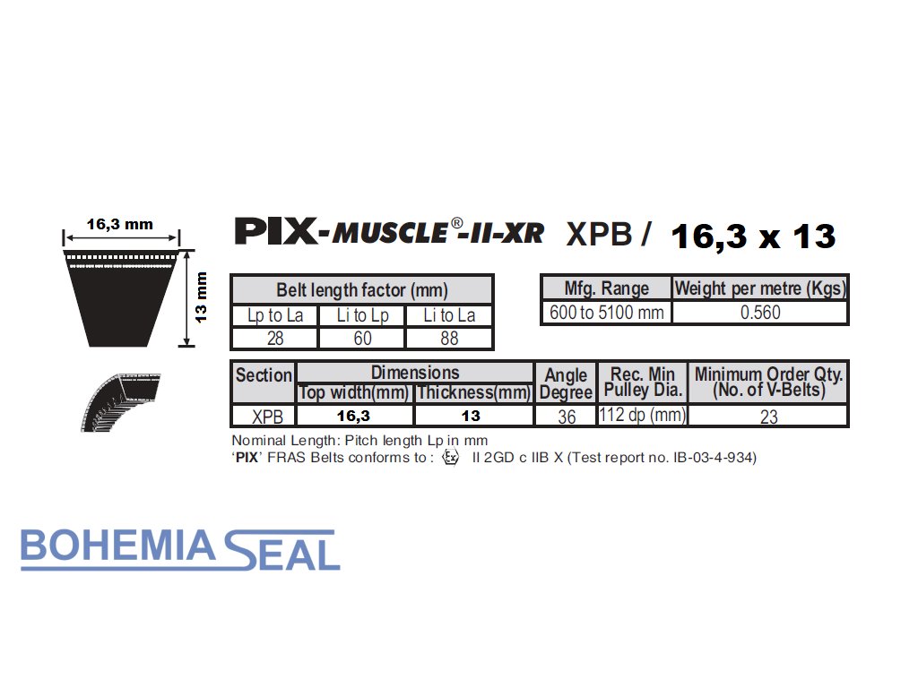 Verstärkter XPB-Industriekeilriemen für hohe Kraftübertragung, Hersteller PIX, Marke PIX-MUSCLE-XR. Breite des Keils auf der Fläche 16,3 (17) mm, Höhe des Keils 13 (14) mm. Wird hauptsächlich anhand der Faserlänge gemessen.