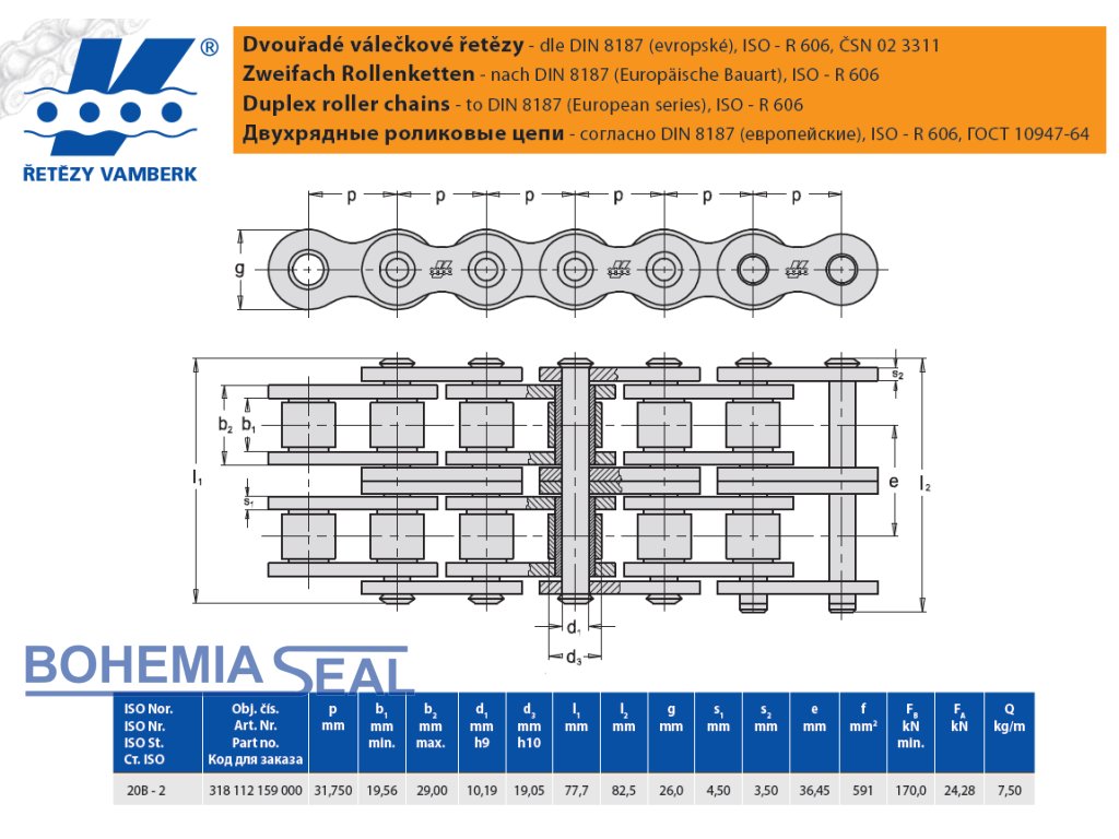 Krummes Glied (gebrochenes Glied, halbes Glied) der Doppelrollenkette 20 B-2 nach DIN 8187, Hersteller VAMBERK CHAIN.