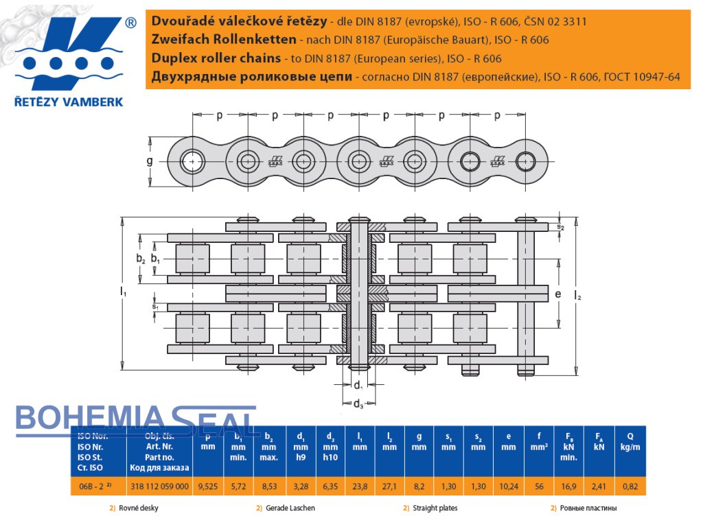 Zweireihige Rollenkette 06 B-2 nach DIN 8187, Hersteller VAMBERK CHAIN. 06 B-Ketten für alle Hersteller werden ursprünglich mit geraden Laschen hergestellt.